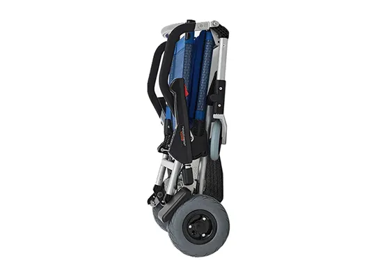 - Easy folding with a single pull release cable; once folded, it fits into the backseat or trunk of a car and can be wheeled like a piece of luggage